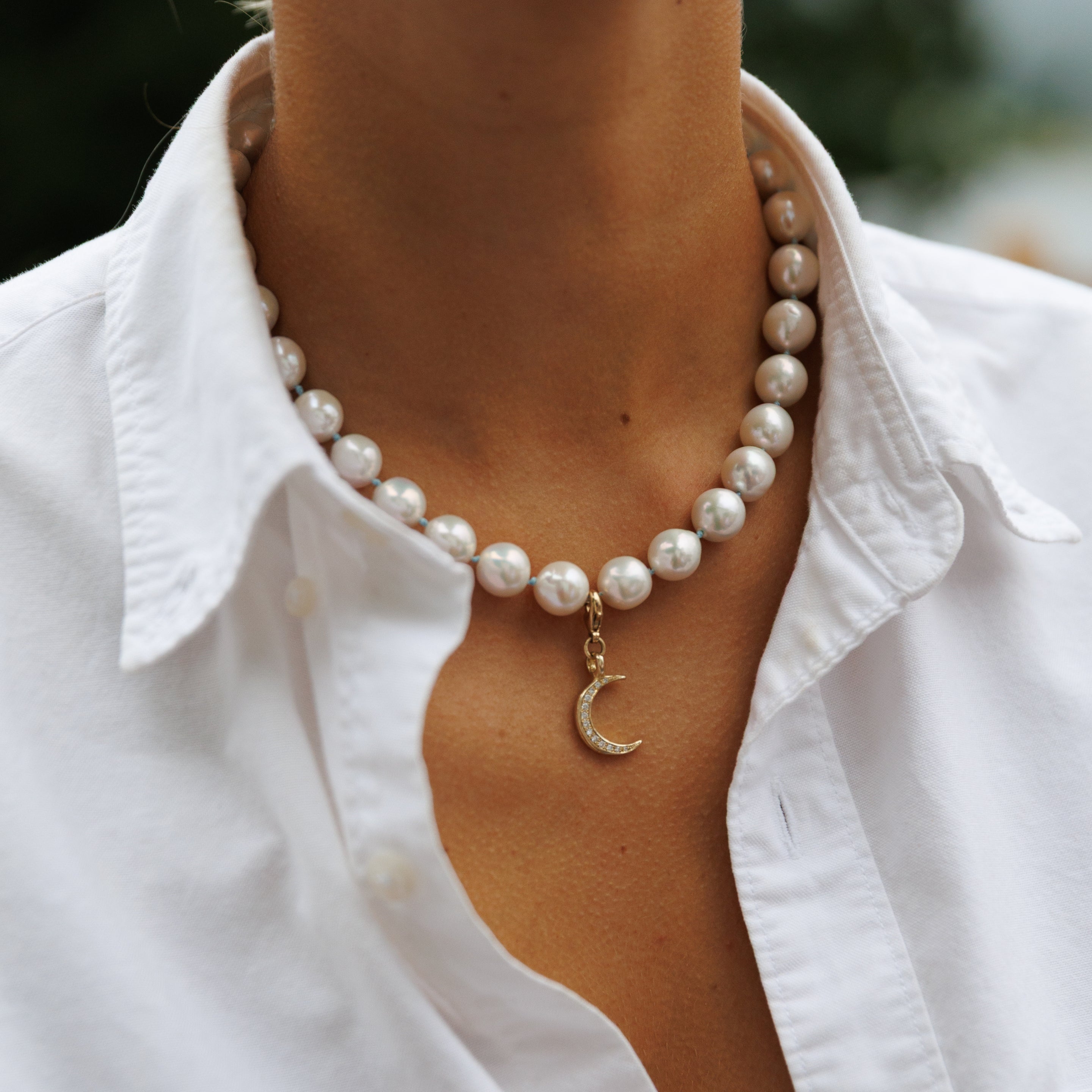 The Medium Crescent Moon Charm is handcrafted from recycled 9ct gold with pavé set diamonds and features a secure lobster clasp to easily fasten to your Daniella Draper chain or bracelet. Perfect for bringing a touch of sparkle and personal meaning to your everyday jewellery.