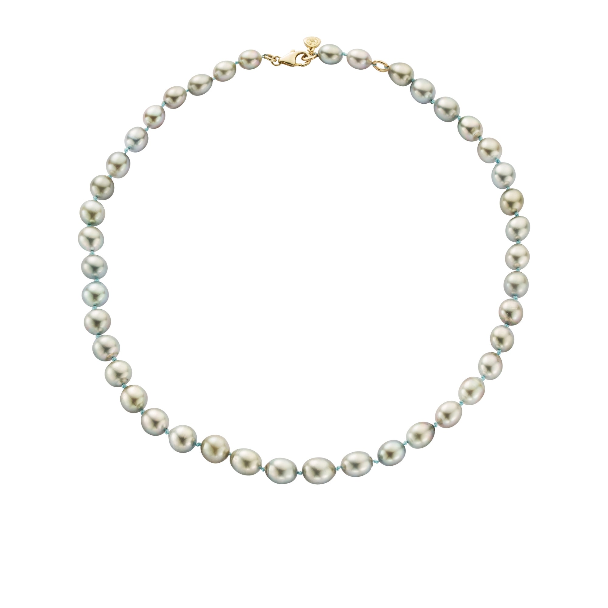 A beautiful pearl necklace of cultured Tahitian grey pearls have been lovingly hand-strung in the UK, using nylon thread for longevity and strength, in Daniella Draper’s signature cornflower blue.