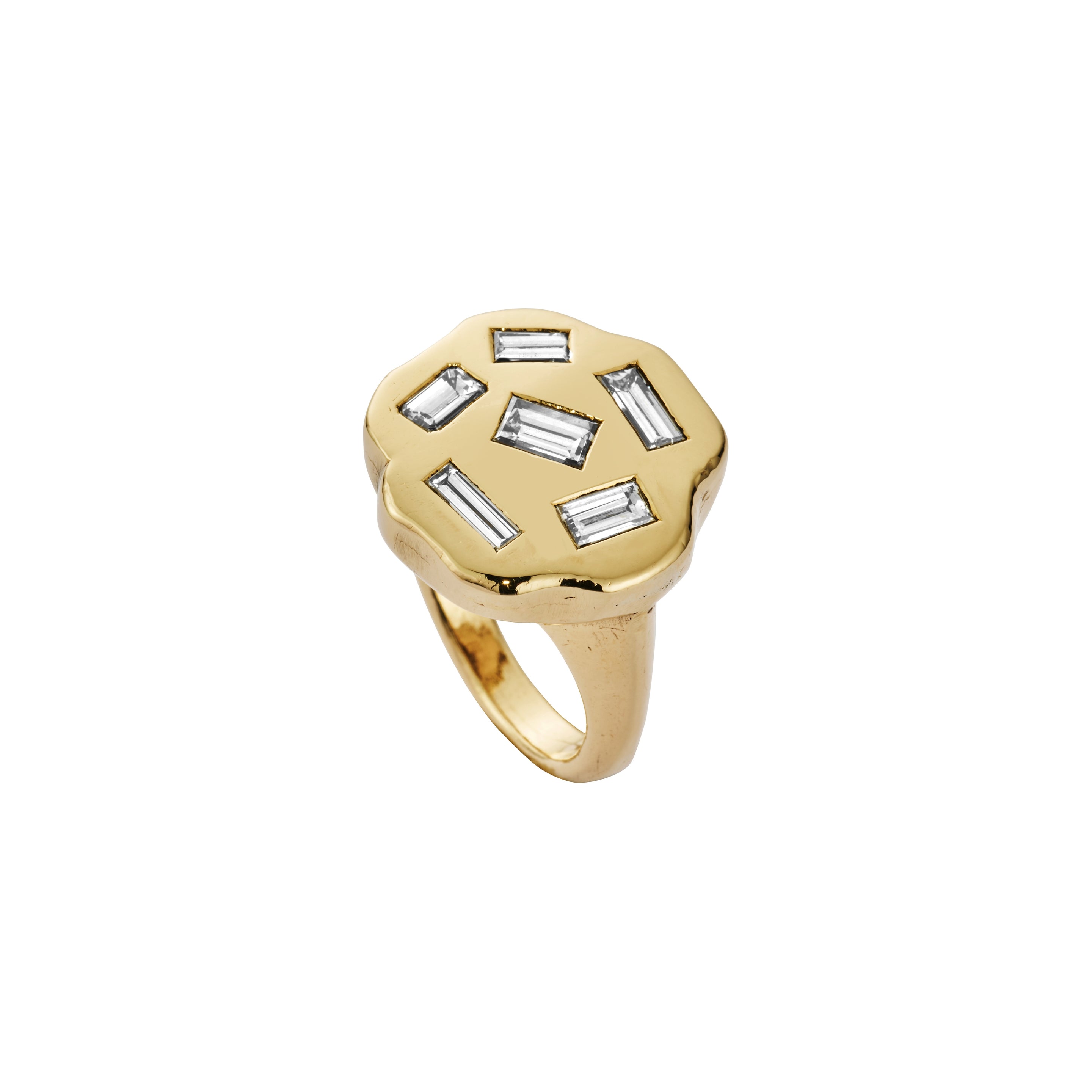 A cluster of six baguette-cut diamonds forms a unique floral design at the centre of the Marguerite Ring, each stone arranged to suggest the simple symmetry of petals. Set in recycled 9ct yellow gold, the ring combines gentle curves with clean geometric lines, resulting in a piece that feels considered and easy to wear.