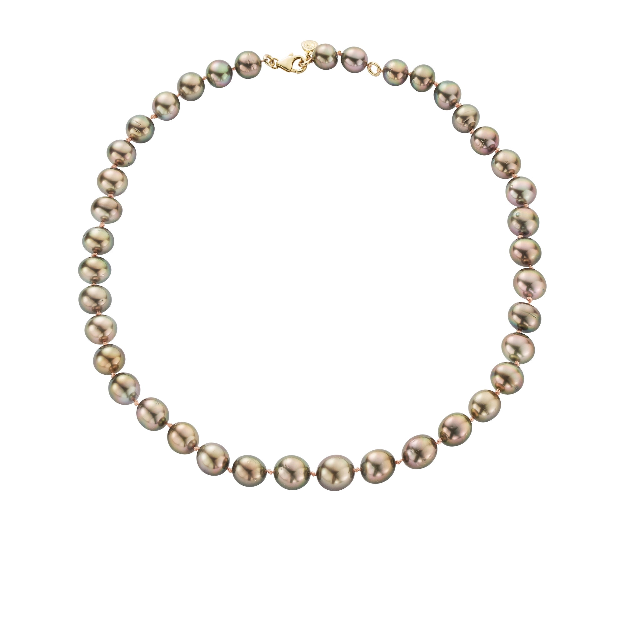 A beautiful pearl necklace of cultured Tahitian bronze pearls with a purple and pink hue have been lovingly hand-strung in the UK, using nylon thread for longevity and strength, in Daniella Draper’s signature cornflower blue.
