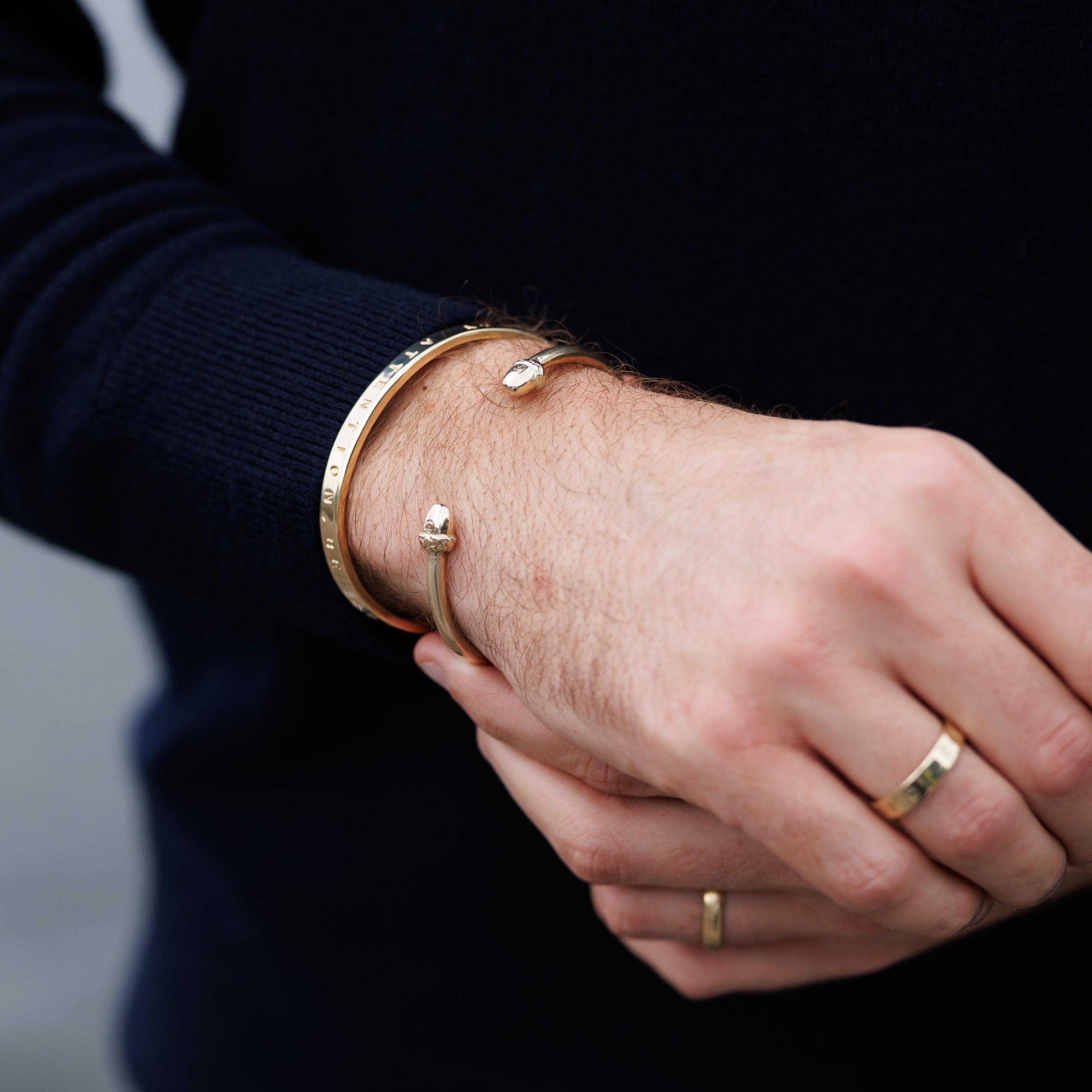 Handcrafted in England using recycled 9ct yellow gold, the Gold Luxury Signature Bangle is a timeless addition to any jewellery box. Perfect for stacking with other DD bracelets or to wear on its own for a more understated look, this unisex design is a perfect his and hers piece.