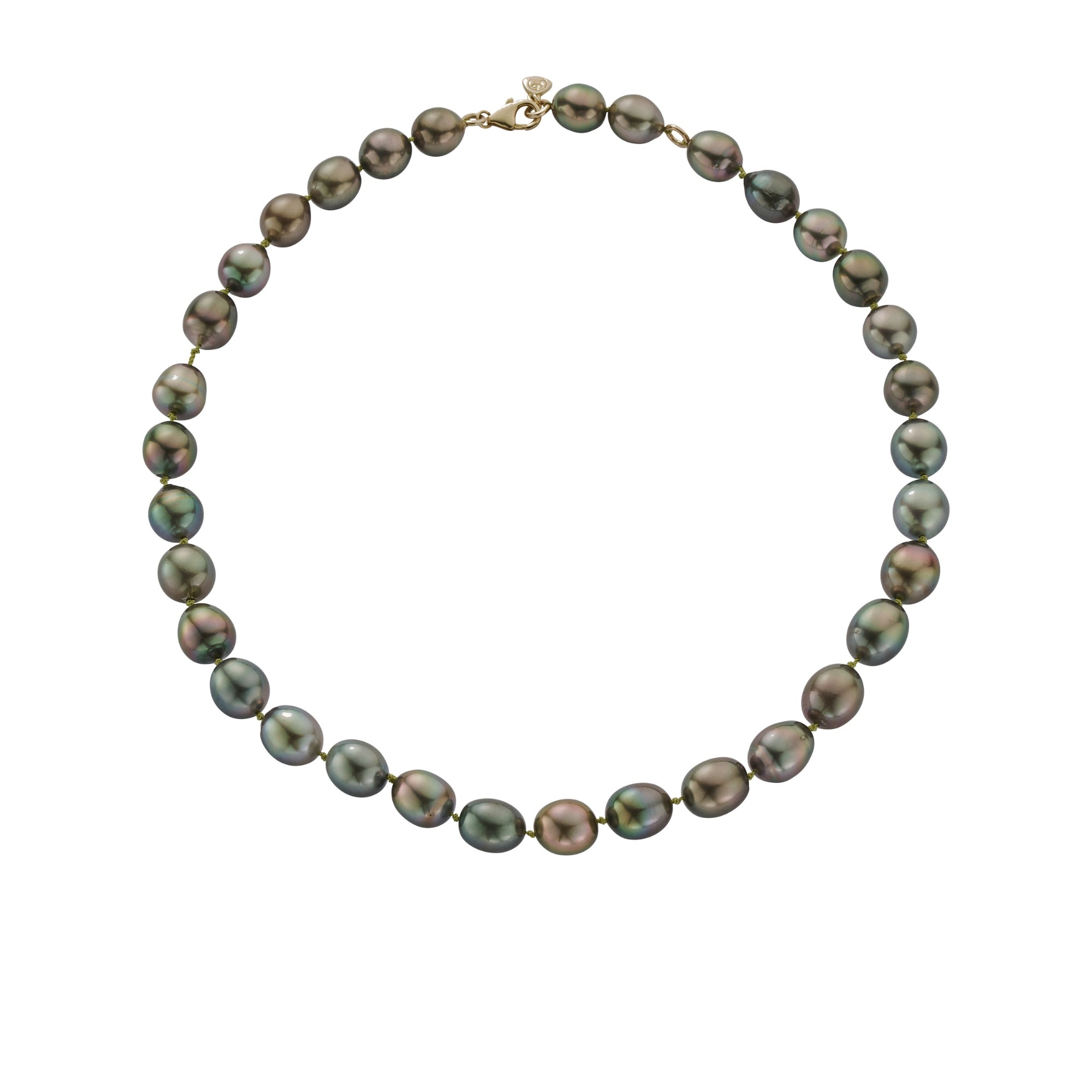 A beautiful pearl necklace of cultured Tahitian pearls with a green and bronze hue have been lovingly hand-strung in the UK, using nylon thread for longevity and strength, in Daniella Draper’s signature cornflower blue.