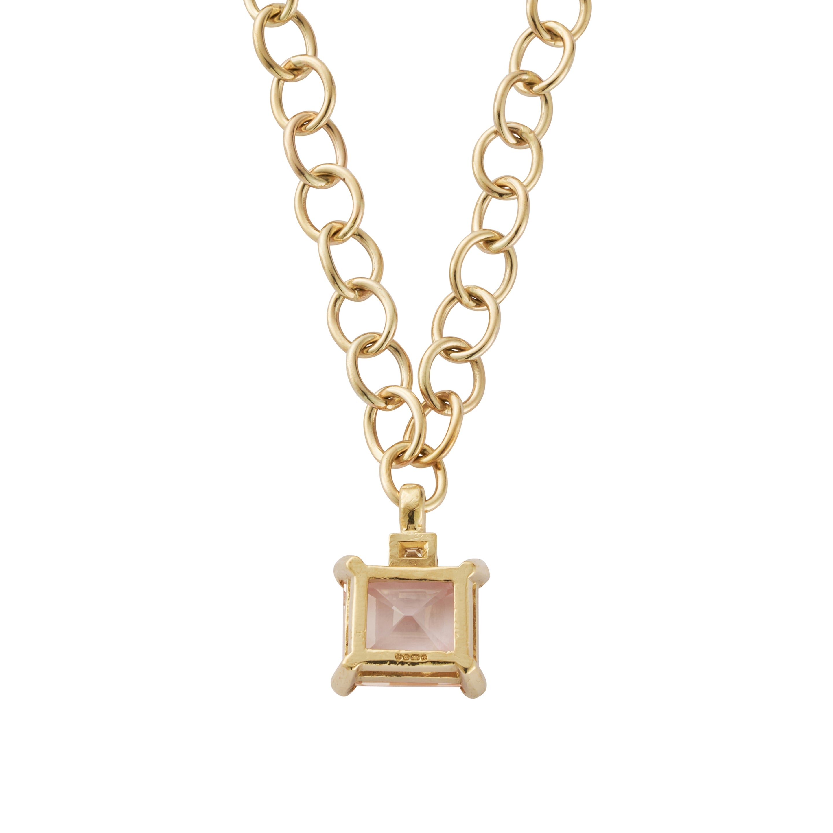 A 9.29ct pink morganite sits in an octagonal claw setting at the centre of the Milena Pendant, topped with a single baguette-cut diamond, all set in recycled 9ct yellow gold on a handmade chain. Its soft blush tones and geometric design create a piece that is both elegant and timeless.