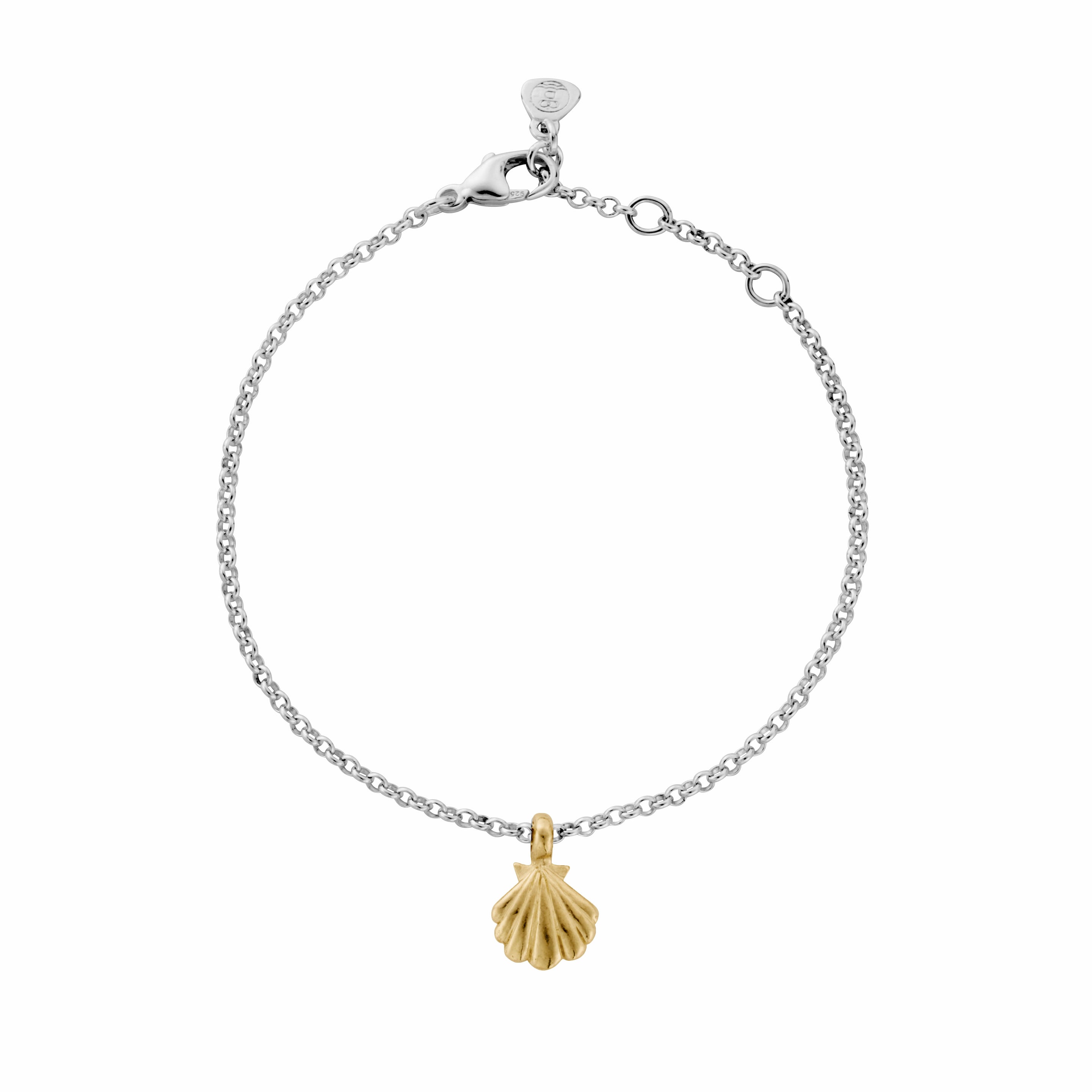 The Silver & Gold Scallop Shell Chain Bracelet is made using recycled 9ct yellow gold and sterling silver. Wear alone or stack with other DD bangles to create your own unique look.
