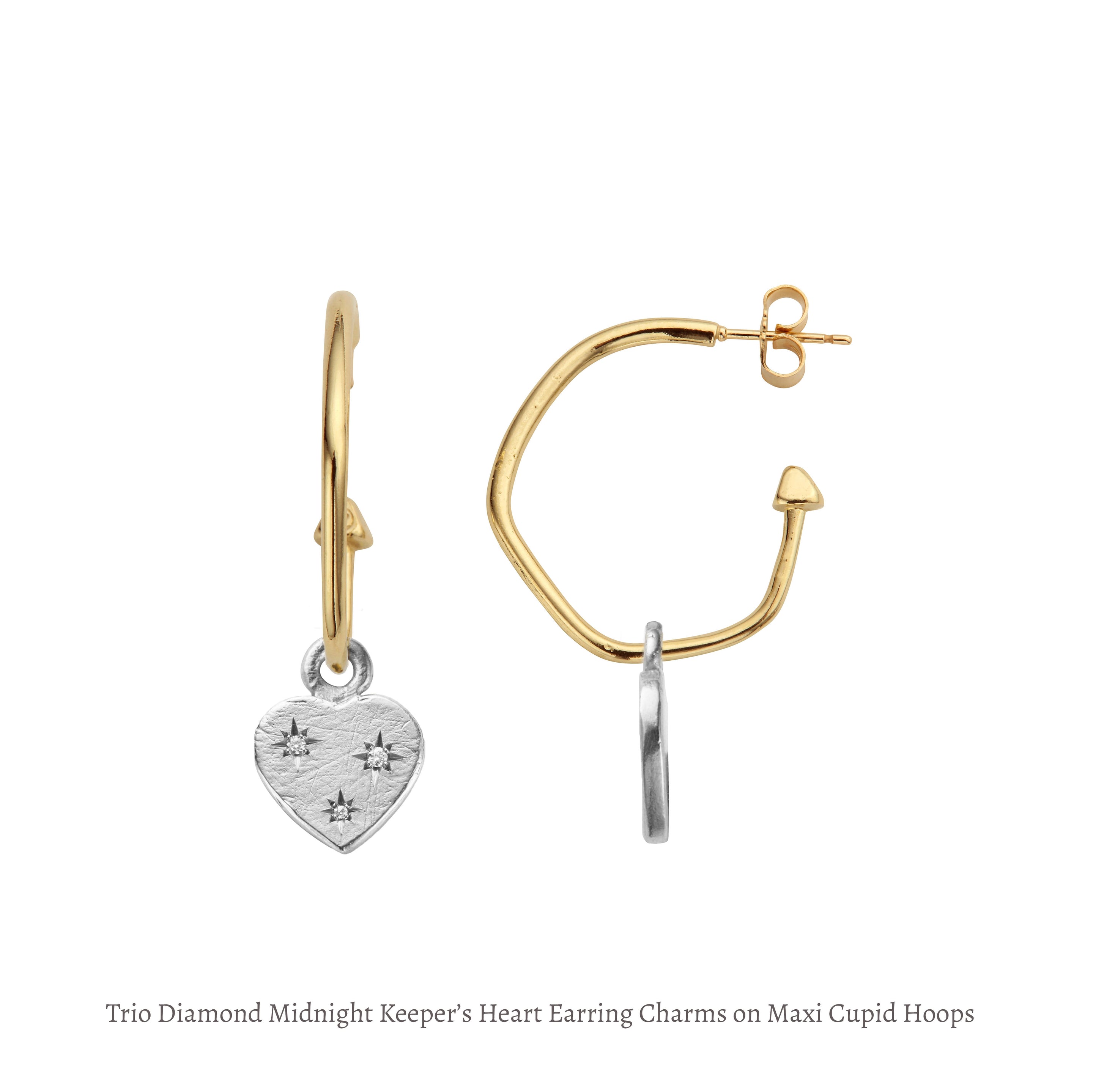 The Silver Keeper’s Heart, reimagined as smaller charms to sit perfectly across our Tiny, Mini or Maxi Cupid Hoop Earrings. Unique to the collection, each charm is set with three diamonds, adding a subtle, considered brilliance. Classic. Simple. Endlessly wearable.